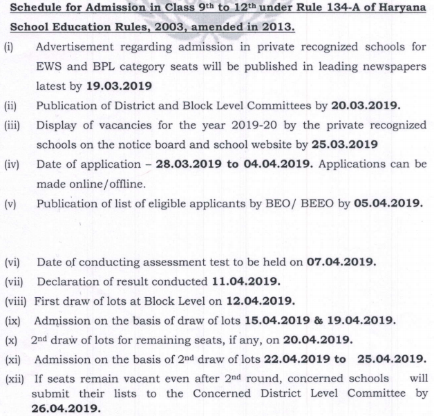 RTE Admission Haryana Class 9 to Class 12 Schedule